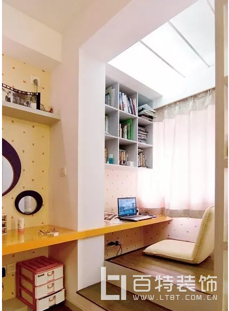 這間書房在汕頭住宅裝修設計中就是利用陽臺打造的。陽臺雖小又如何,照樣做一整排的榻榻米,還能擺放一個轉角書桌,強大!